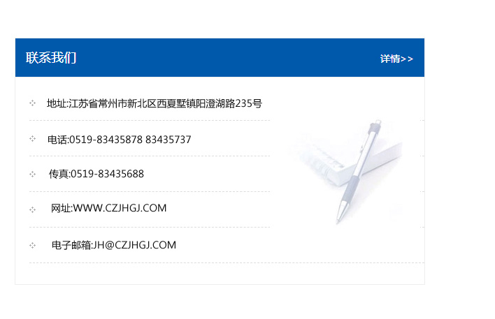 地址:常州市新北區友邦商務大廈1幢16、17層  電話:0519-85101652  傳真:0519-85112595  郵編:213022  網址:www.cz-jiayue_cn.gaojingyuan.com  郵箱:xiajifengaa@163.com